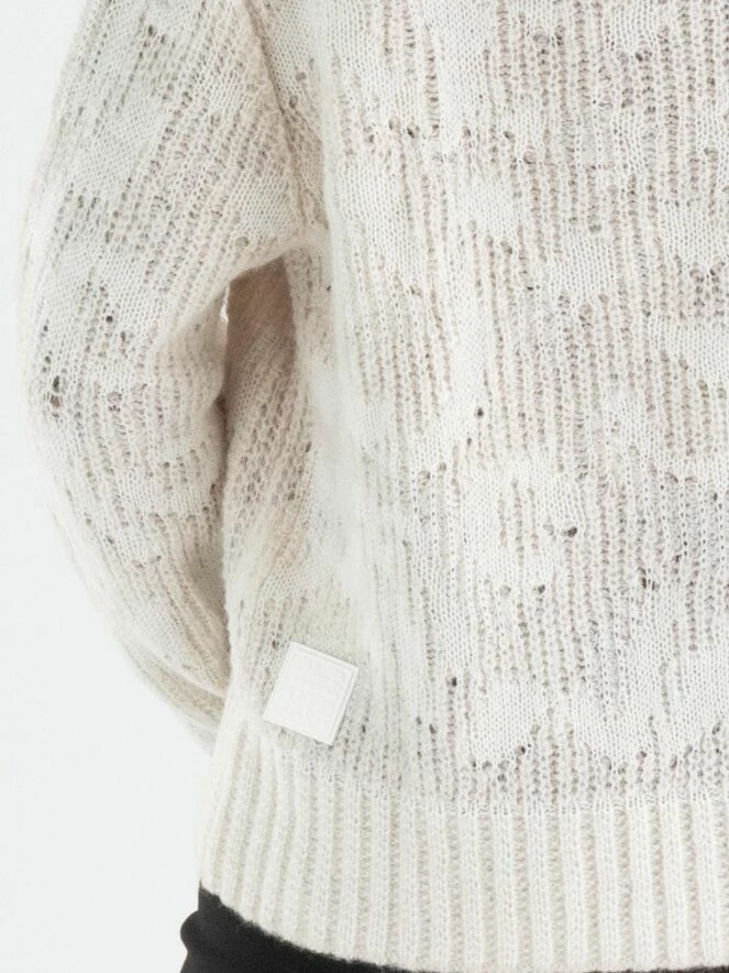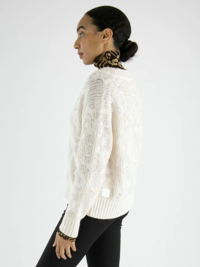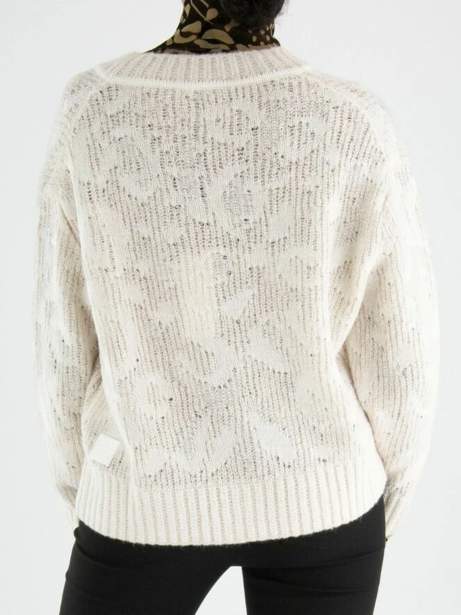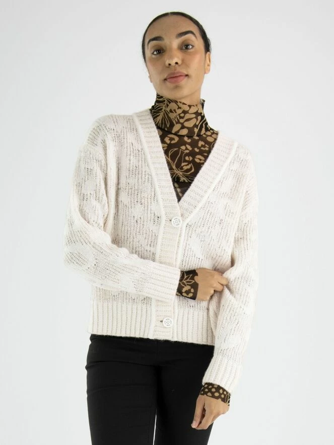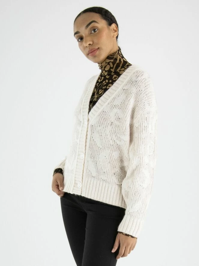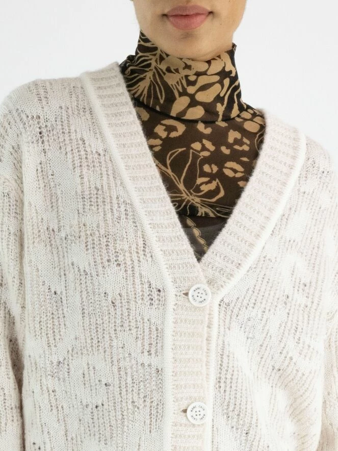 Un gilet tricoté ouvert de Marc Cain en blanc laineux. Le gilet présente un col en V avec une fermeture à trois boutons. Aux extrémités des manches longues et en bas, il y a un bord côtelé. Ce gilet peut être lavé à la main.