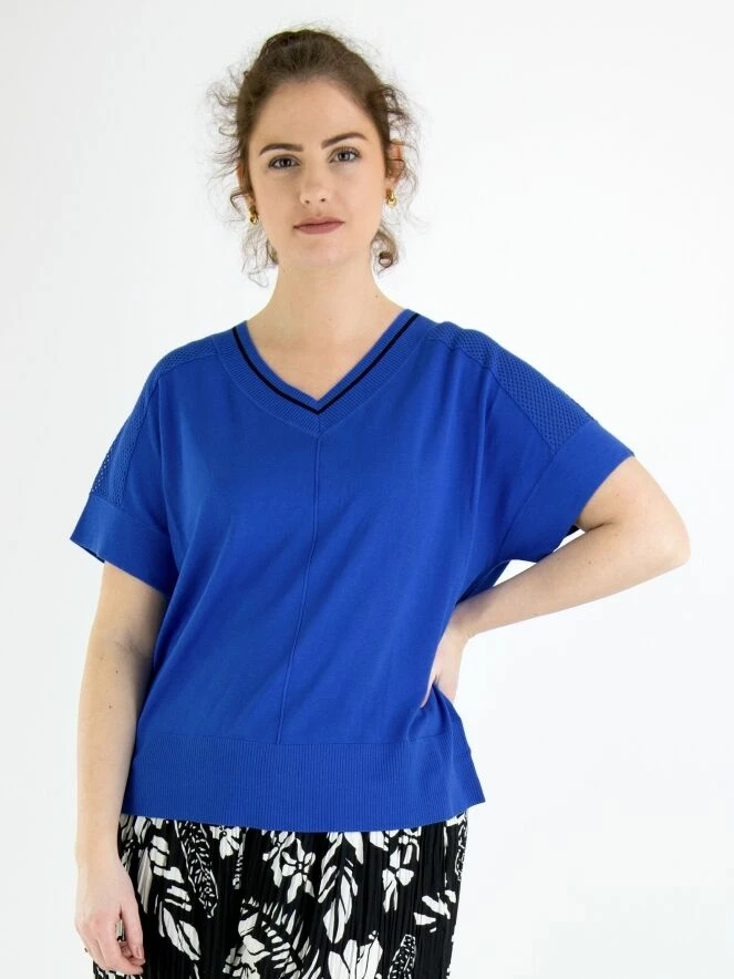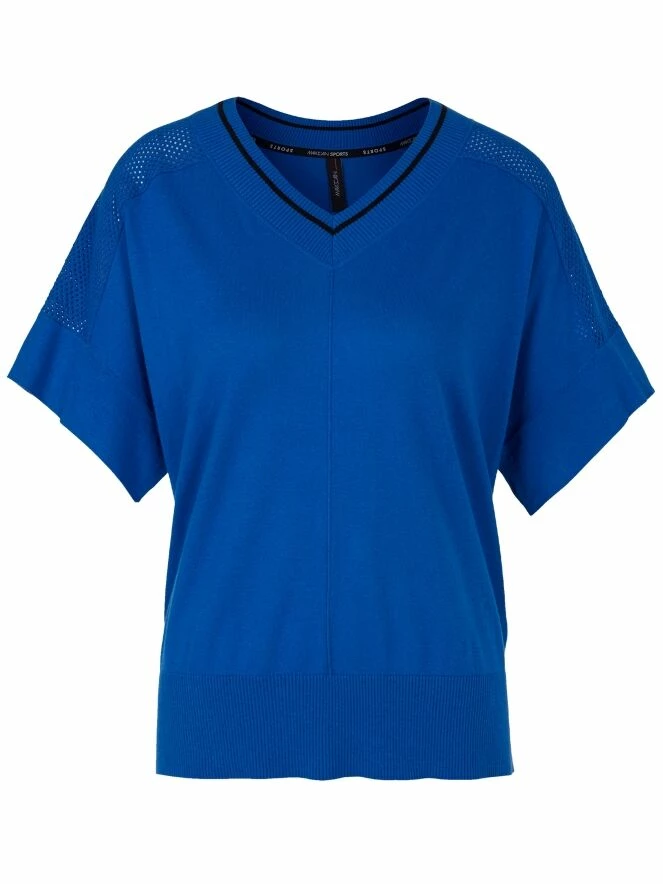 Un chemisier de Marc Cain dans la couleur bleu cobalt. Le long du bord de l’encolure en V se trouve un col en tricot finement cĂ´telĂ© avec une rayure noire. Depuis les Ă©paules, le haut des manches est en tissu perforĂ©. En bas, il y a un large col en tricot cĂ´telĂ©. Ce chemisier peut ĂŞtre lavĂ© Ă 30 degrĂ©s.