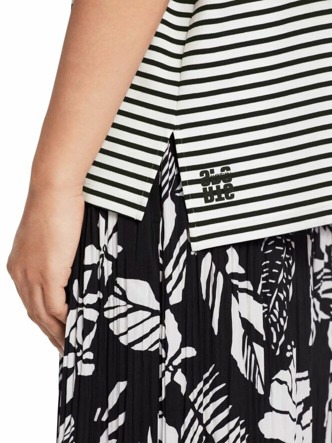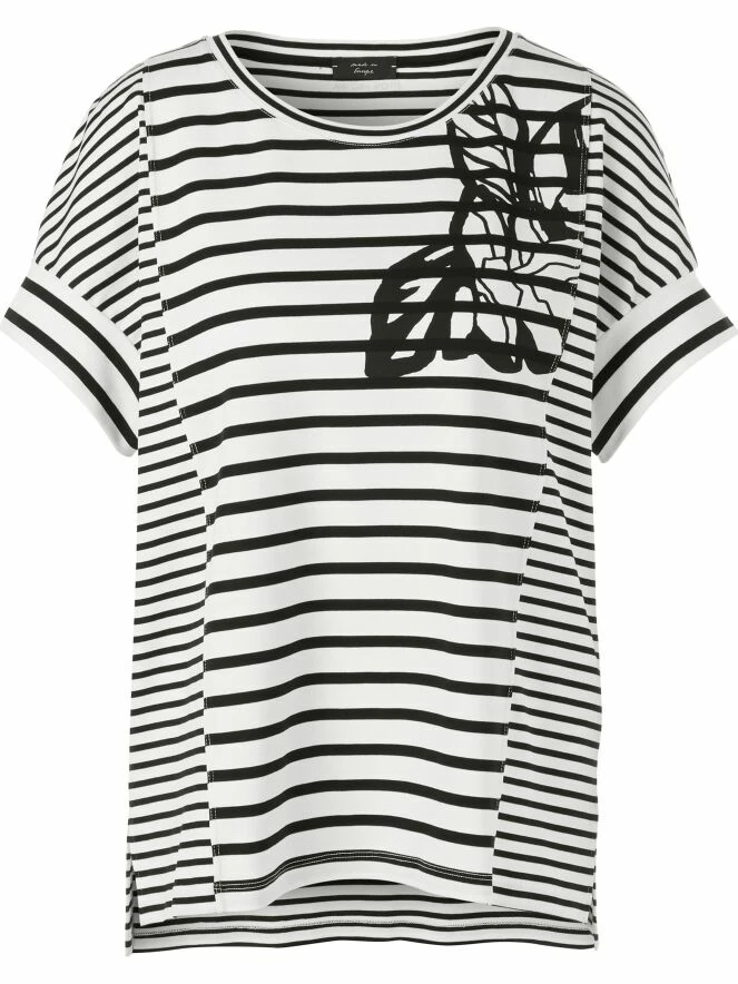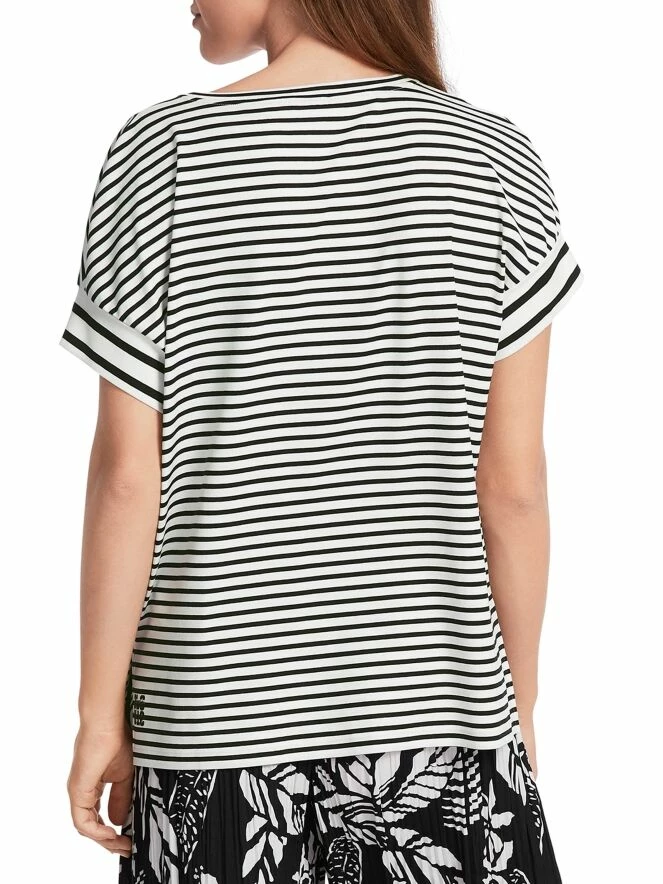 Un chemisier Marc Cain avec deux motifs de rayures différents dans les couleurs blanches et noires. Le long du bord de l’encolure ronde, il y a une garniture à rayures. Ce chemisier peut être lavé à 30 degrés.
