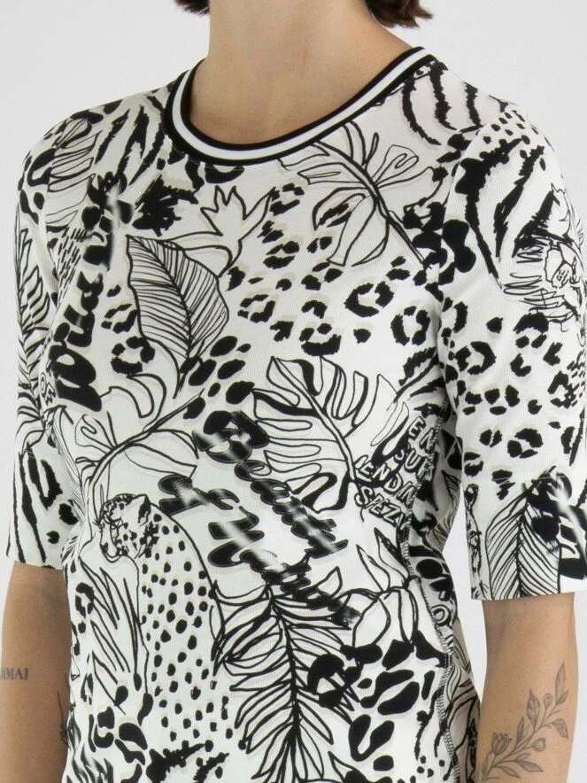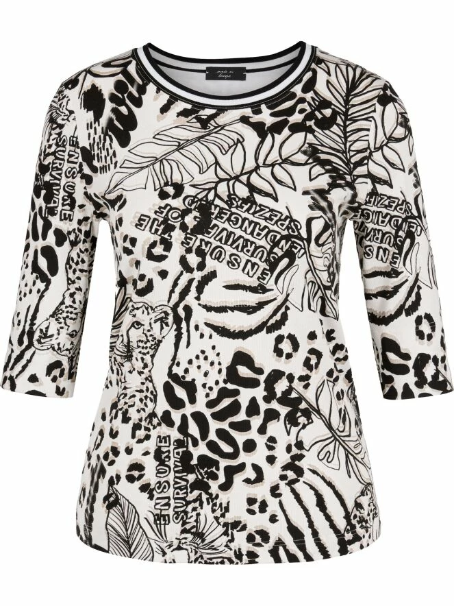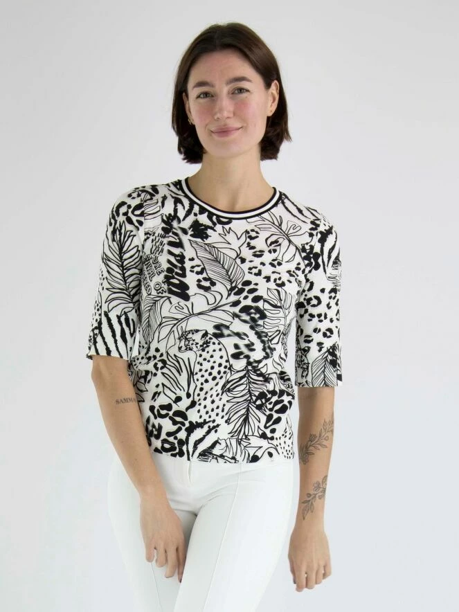 Un chemisier de Marc Cain avec un imprimé graphique de feuilles et de panthères en noir et sable sur un fond blanc crème. Le chemisier a un col rond et des manches courtes. Ce chemisier peut être lavé à 30 degrés.