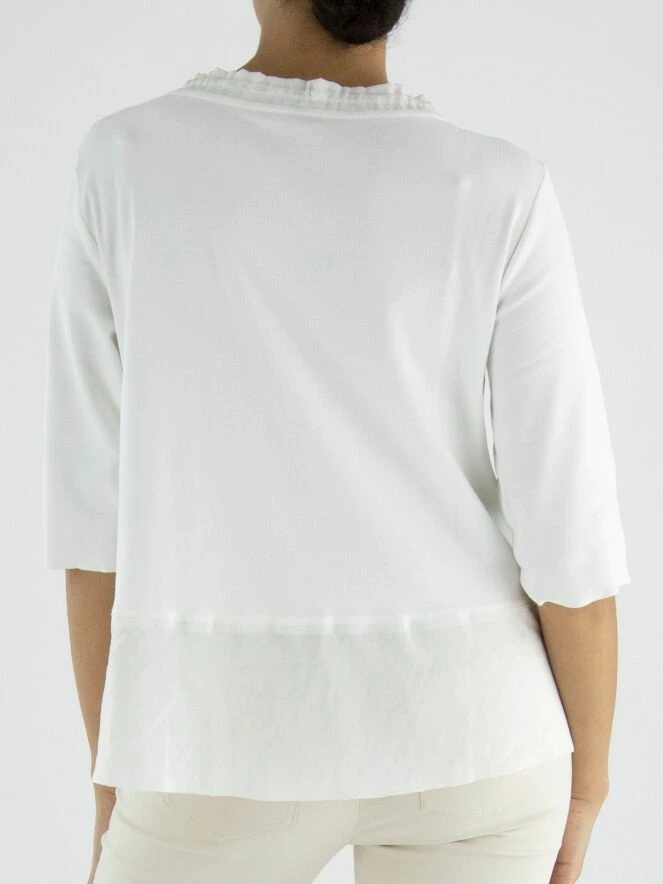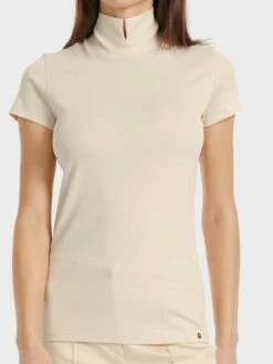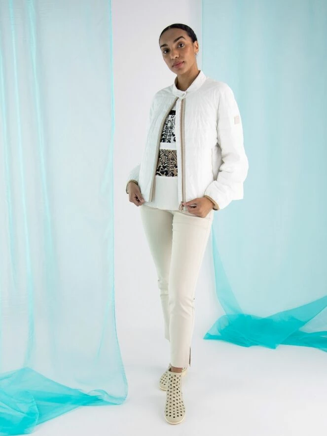 Un chemisier crème blanc de Marc Cain avec à l’avant deux larges bandes aux imprimés graphiques en couleurs camel et crème blanc combinées avec du noir. Le long du col se trouve une bordure en satin mat avec un cordon dans une finition tunnel. En dessous des imprimés, il y a un tissu en satin mat. L’arrière est de couleur crème blanc uni. Ce chemisier peut être lavé à 30 degrés.
