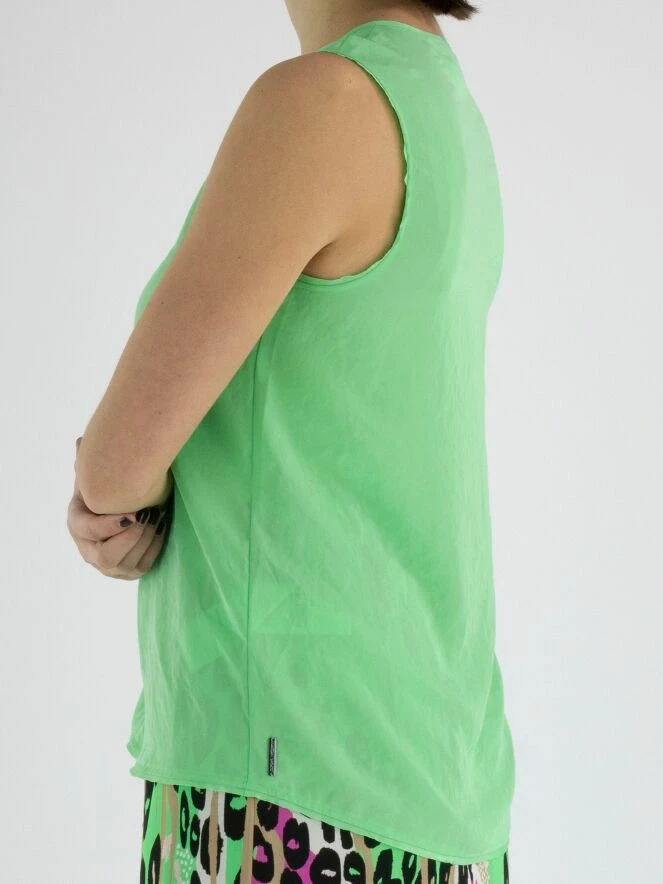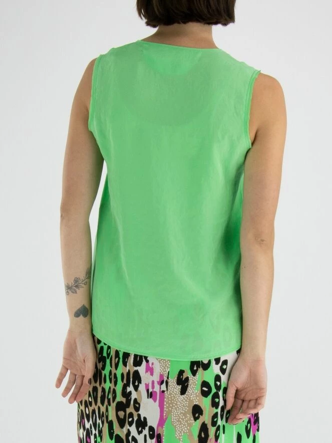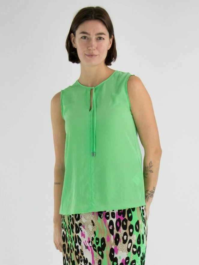 Un top de Marc Cain dans une couleur verte claire. Au milieu du col rond, il y a une découpe en V avec deux cordons. De cette ligne en V, il y a trois lignes de couture descendant jusqu’au bas du top. Ce top peut être lavé à 30 degrés.
