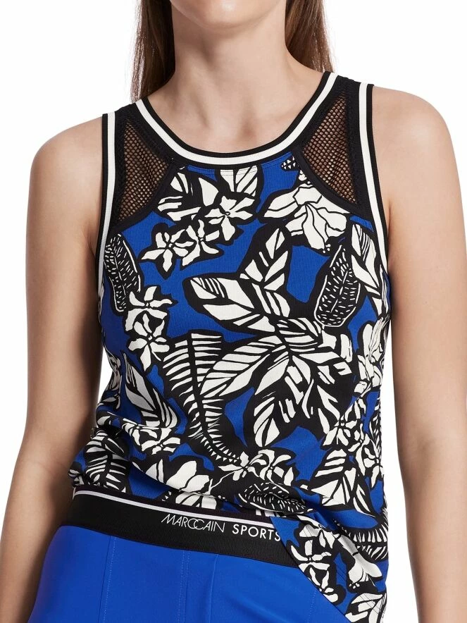 Un top de Marc Cain avec un imprimé graphique de fleurs avec des feuilles en bleu cobalt, blanc et noir. Les bretelles sont dans une structure de filet ouvert. Le long des bords du col rond et des emmanchures se trouve une bordure en tricot finement côtelée et rayée. Ce top peut être lavé à 30 degrés.