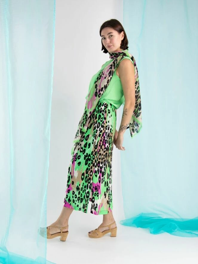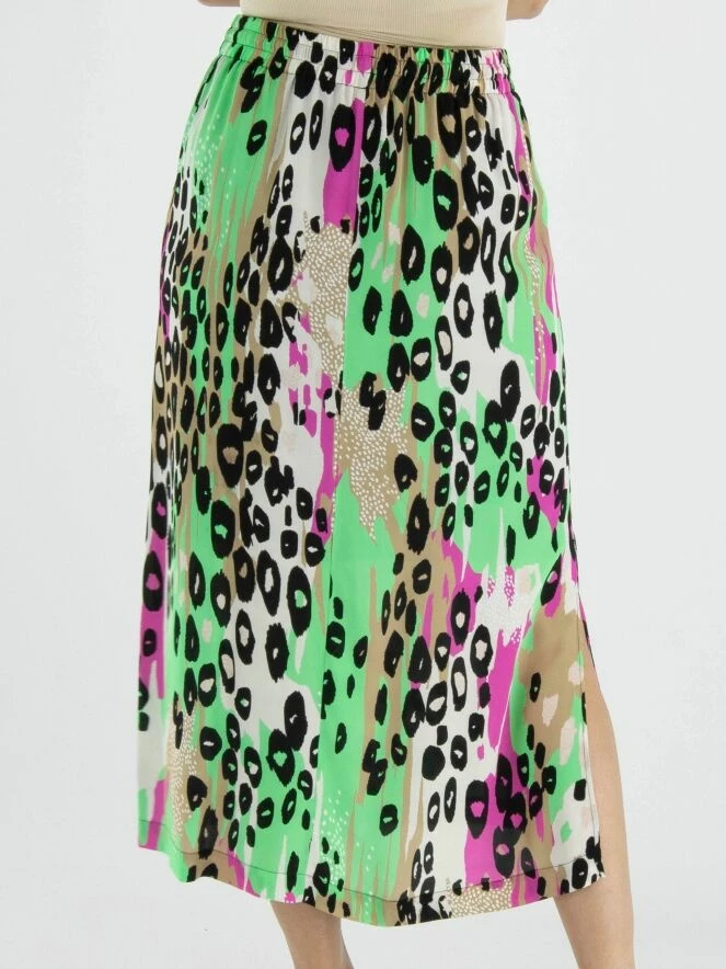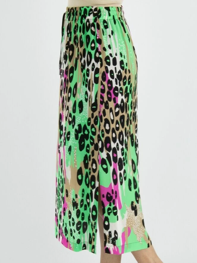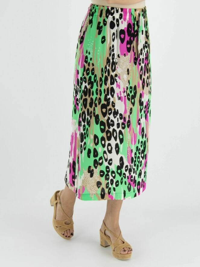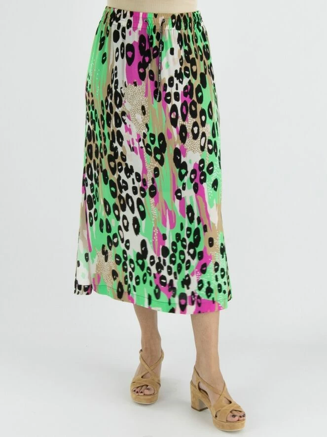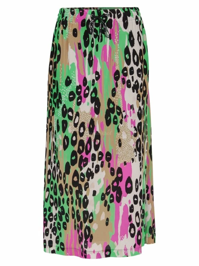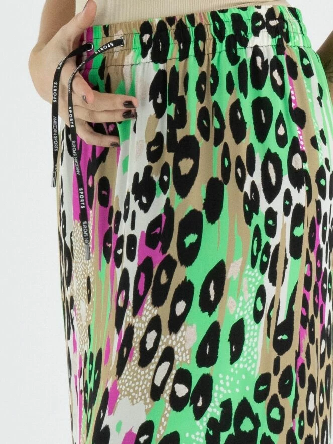 Une jupe de Marc Cain avec un imprimĂ© graphique en vert, camel, noir et fuchsia. La taille est dotĂ©e d’une large bande Ă©lastique finement cĂ´telĂ©e avec un cordon dans une finition tunnel. En bas, il y a des fentes profondes des deux cĂ´tĂ©s. La jupe est doublĂ©e et peut ĂŞtre lavĂ©e Ă 30 degrĂ©s.