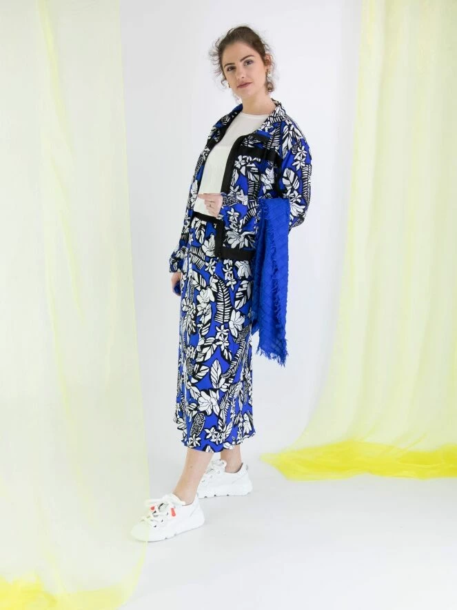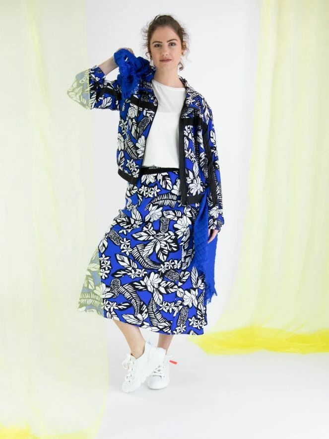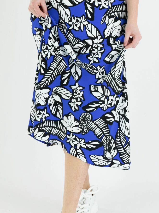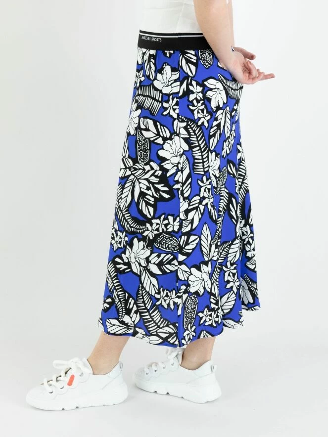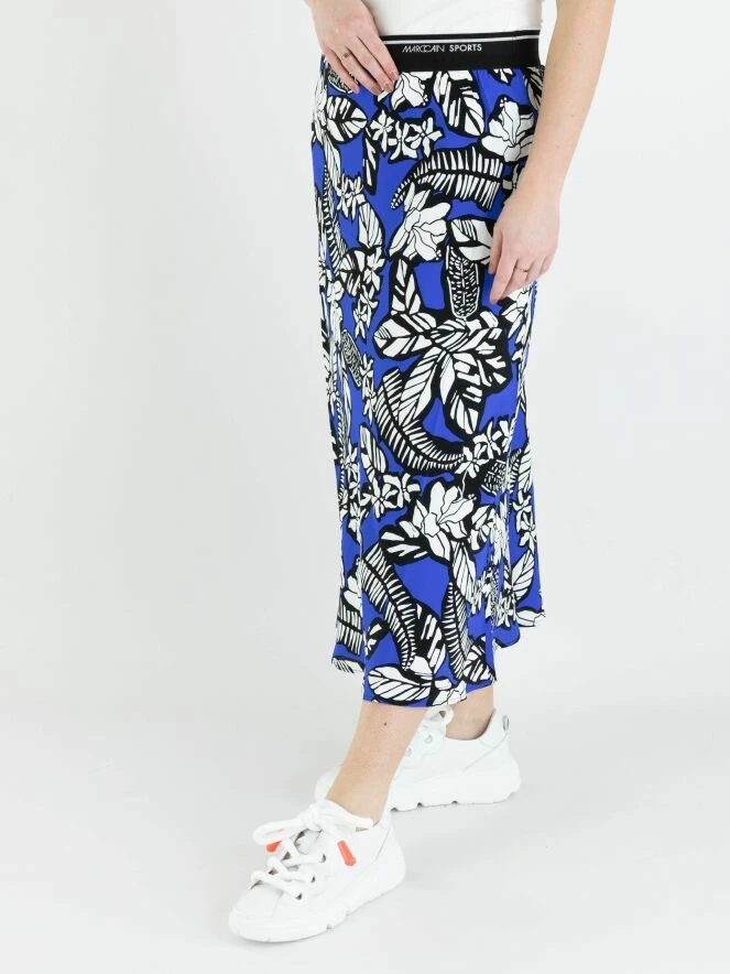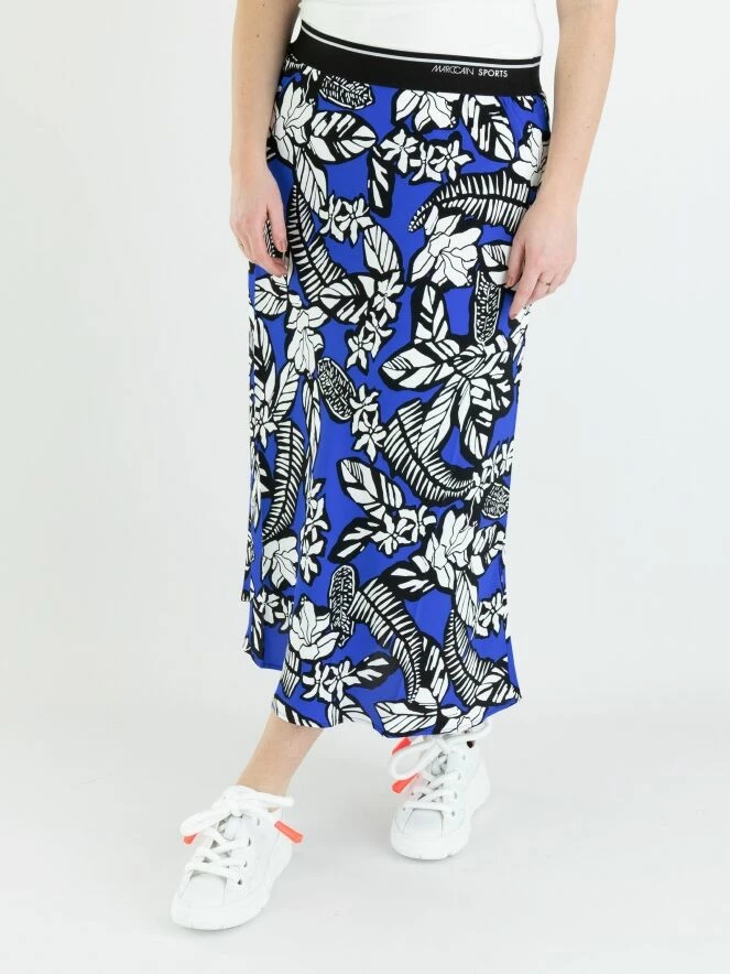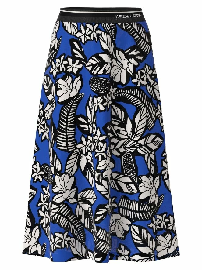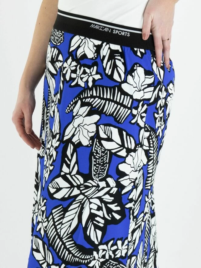 Une longue jupe Marc Cain avec un imprimé graphique de fleurs et de feuilles dans les couleurs bleu cobalt, blanc et noir. La jupe a une ceinture élastique, n’est pas doublée et a une silhouette en A. Elle peut être lavée à 30 degrés.