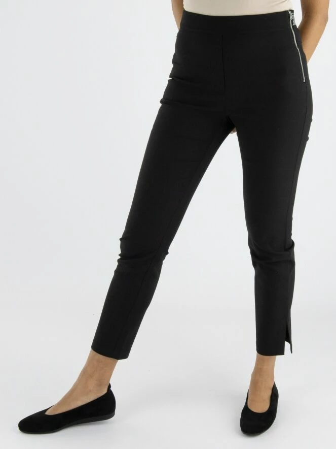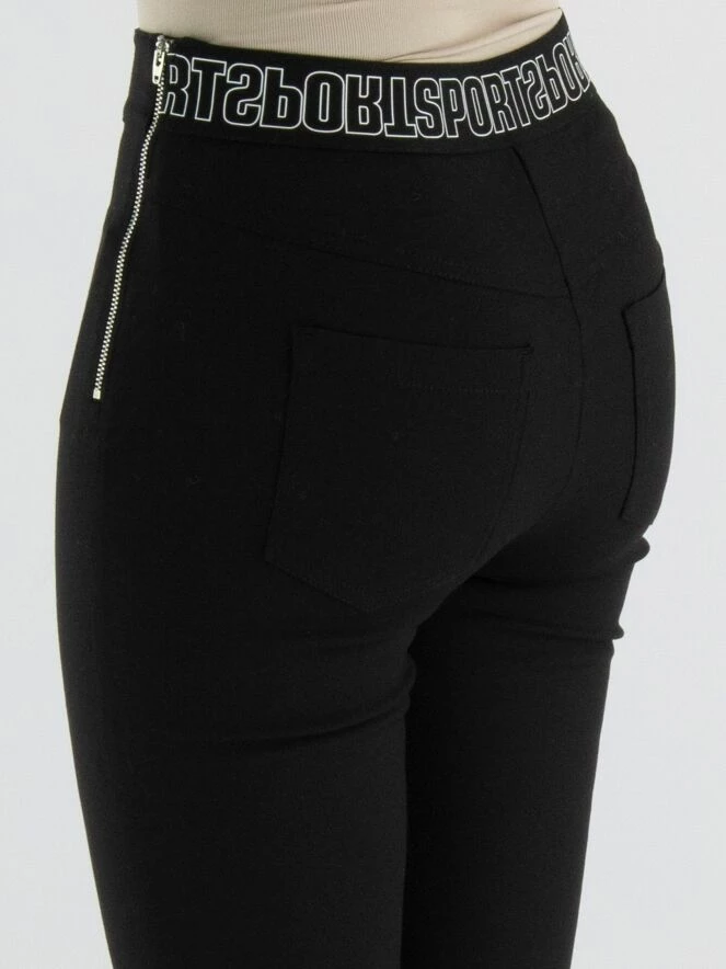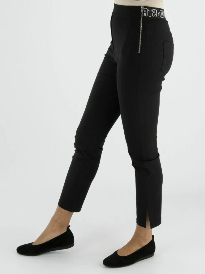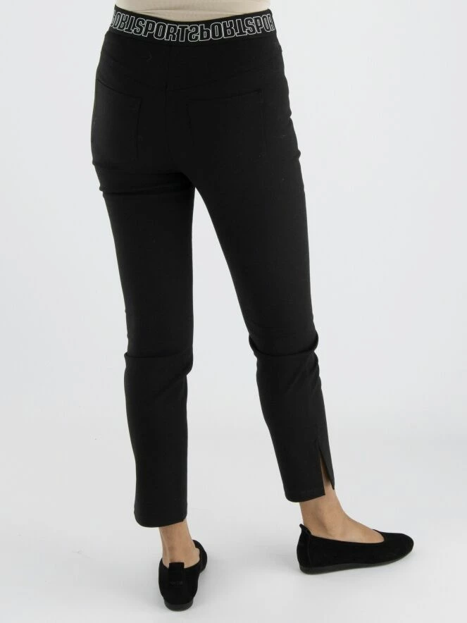 Un pantalon de Marc Cain en noir. À l’arrière de la taille, il y a une bande élastique avec le texte « Marc Cain Sports ». Il y a une fermeture éclair sur le côté. Ce pantalon peut être lavé à 30 degrés.