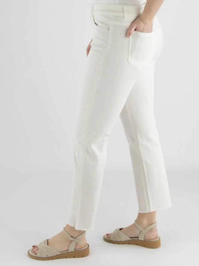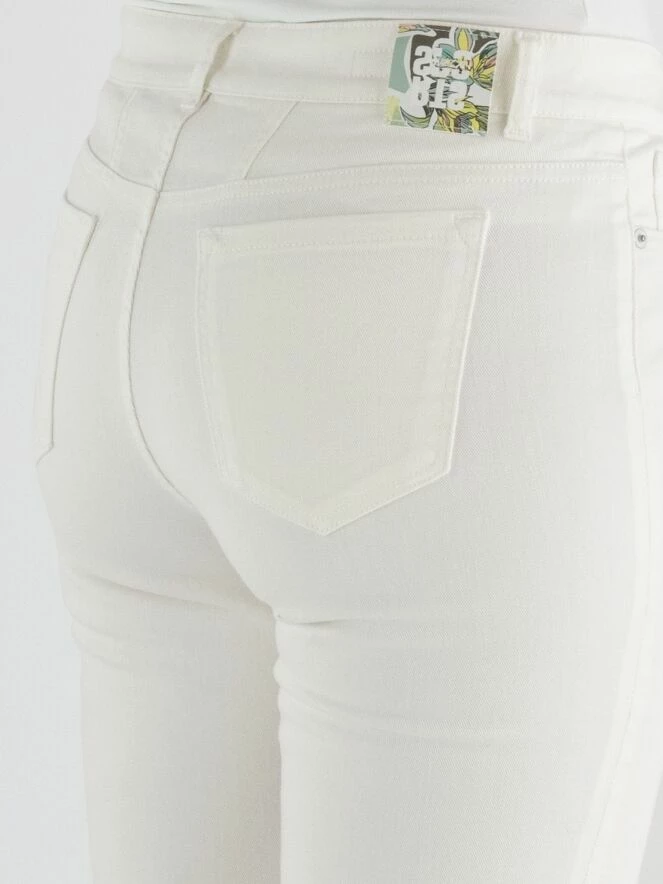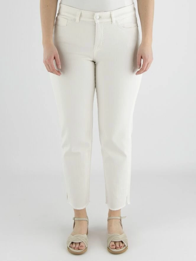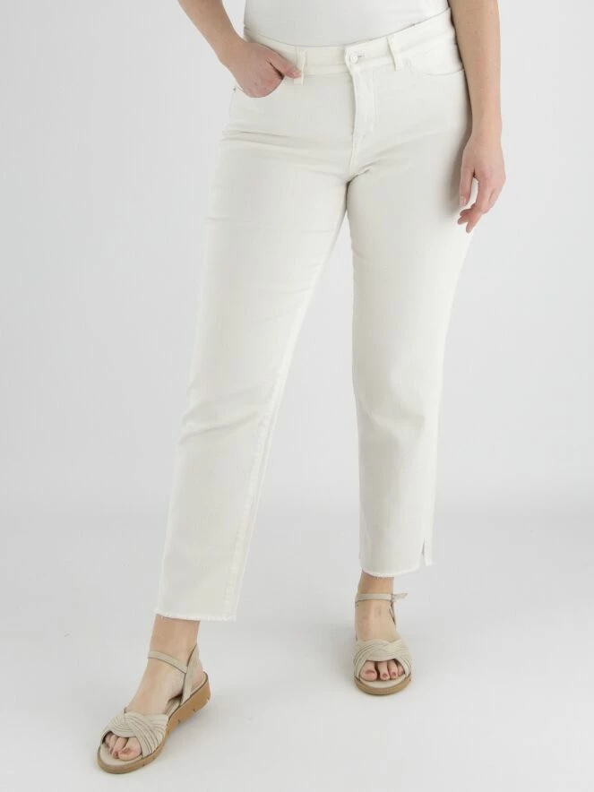 Un jean de Marc Cain de couleur blanc crème. Le jean est de modèle à 5 poches. L’ourlet en bas des jambes est finement effiloché, et il y a une petite fente sur les côtés. Ce jean peut être lavé à 30 degrés.