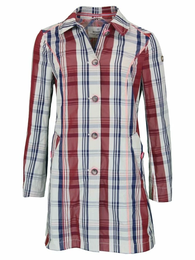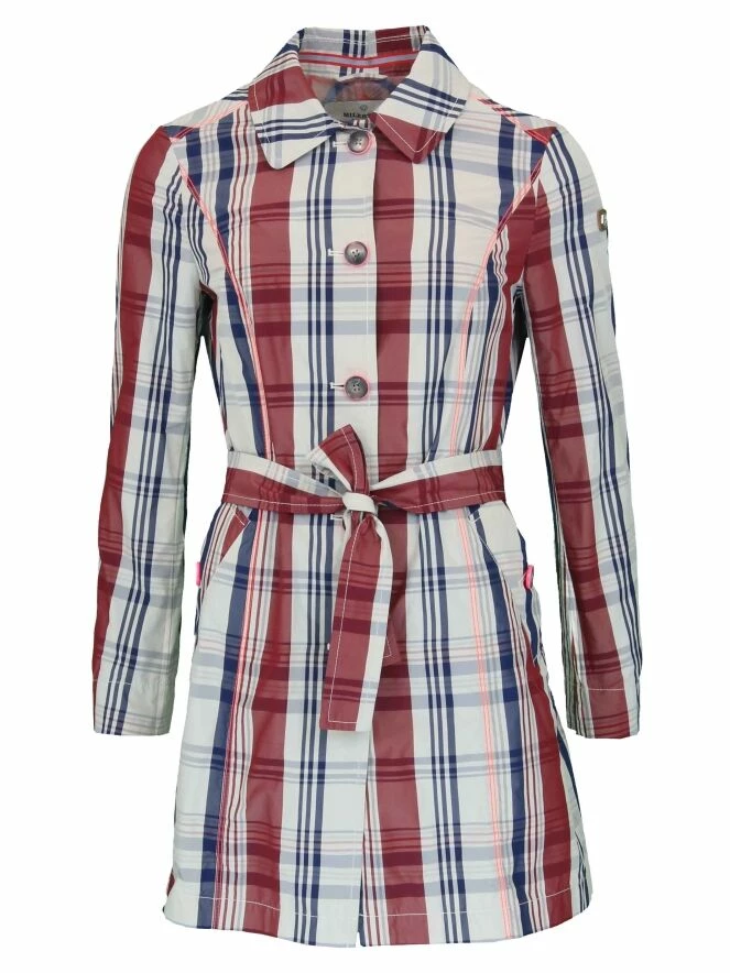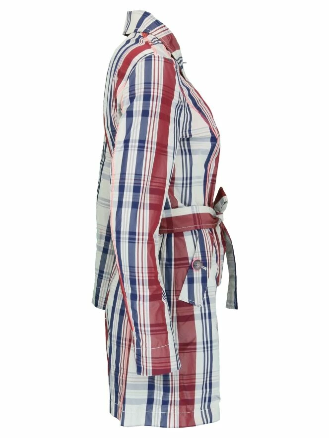 Trench-coat de la marque Milestone, dans un imprimĂ© Burberry au quadrillage de couleurs beige, bleu marine et rouge bordeau. Les bords des boutons sont de couleur rose. Le manteau est Ă©quipĂ© de poches latĂ©rales avec un bouton dĂ©coratif sur le milieu du revers et d’une ceinture amovible se nouant Ă la taille. Modèle non doublĂ©. Lavage Ă 30 degrĂ©s.
