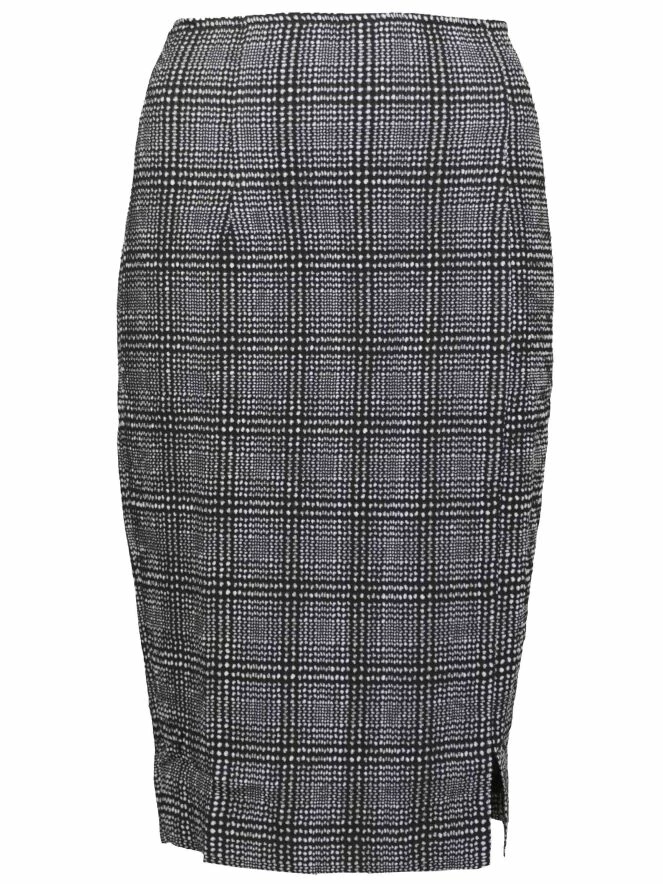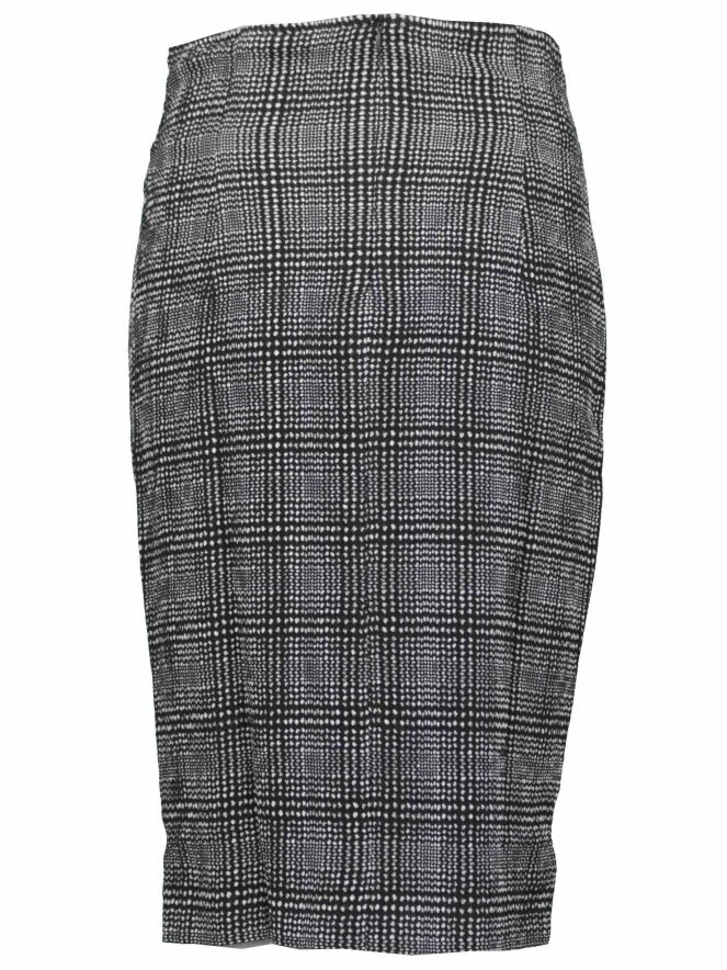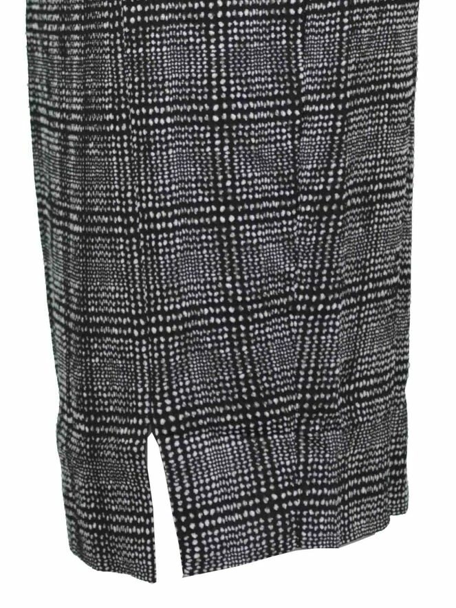 Jupe à petites fentes latérales, de la marque ML Collection, à imprimé Prince de Galles noir et blanc. Elle tombe sur le genou. Modèle doublé. Lavage déconseillé.