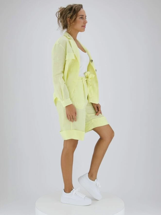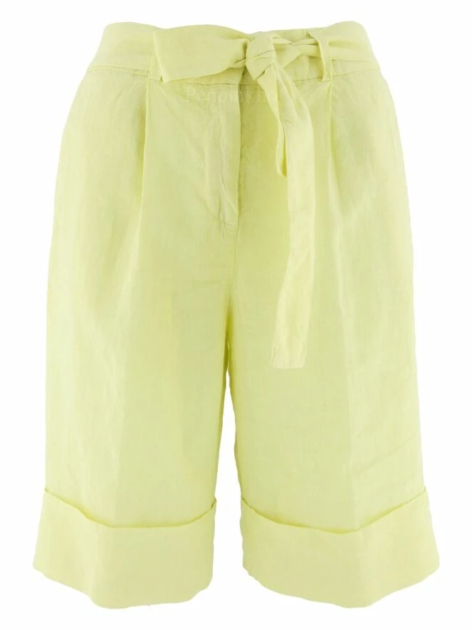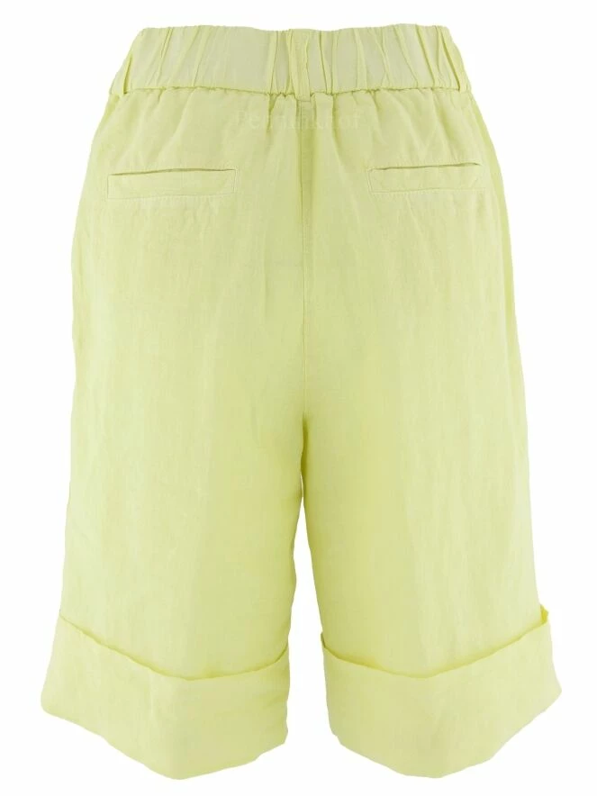 Bermuda de la marque Peserico, de couleur jaune clair. La taille est Ă©quipĂ©e d’une bande Ă©lastique finement froncĂ©e dans le dos et d’une ceinture dans le mĂŞme tissu. Poches latĂ©rales et large revers au bas des jambes. Lavage Ă 30 degrĂ©s.