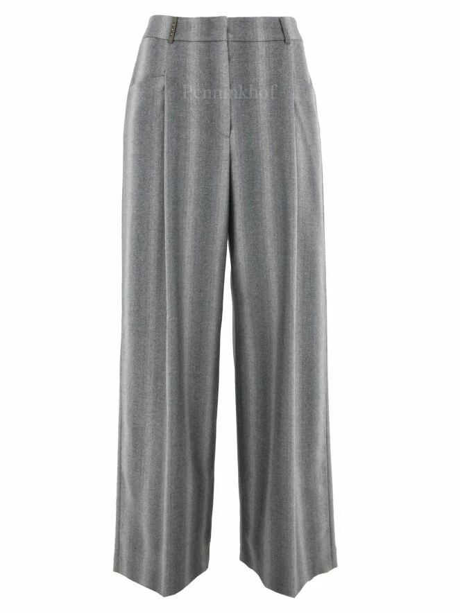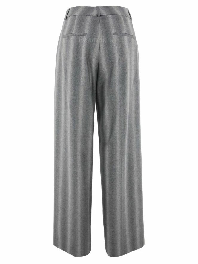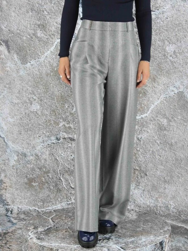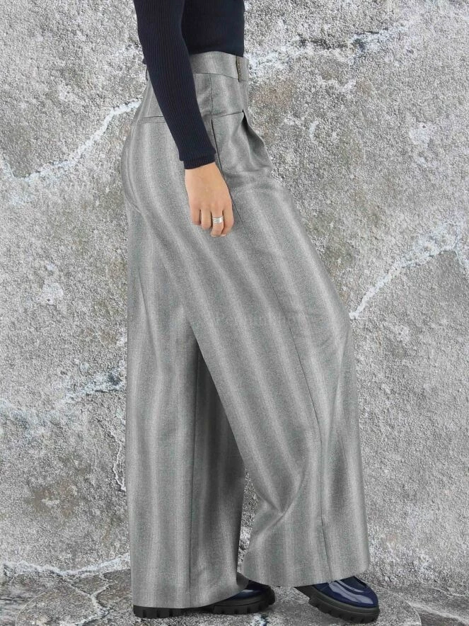 Pantalon Ă jambes larges de la marque Peserico, dans une structure Ă rayures mixtes aux multiples nuances de gris clair. Un fin fil d’argent est insĂ©rĂ© dans le tissu. Le pantalon est dotĂ© de deux plis qui apportent au tissu de la jambe un « look » souple et ondulĂ©. Lavage dĂ©conseillĂ©.