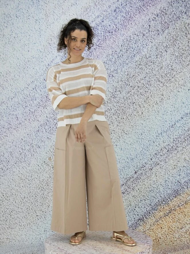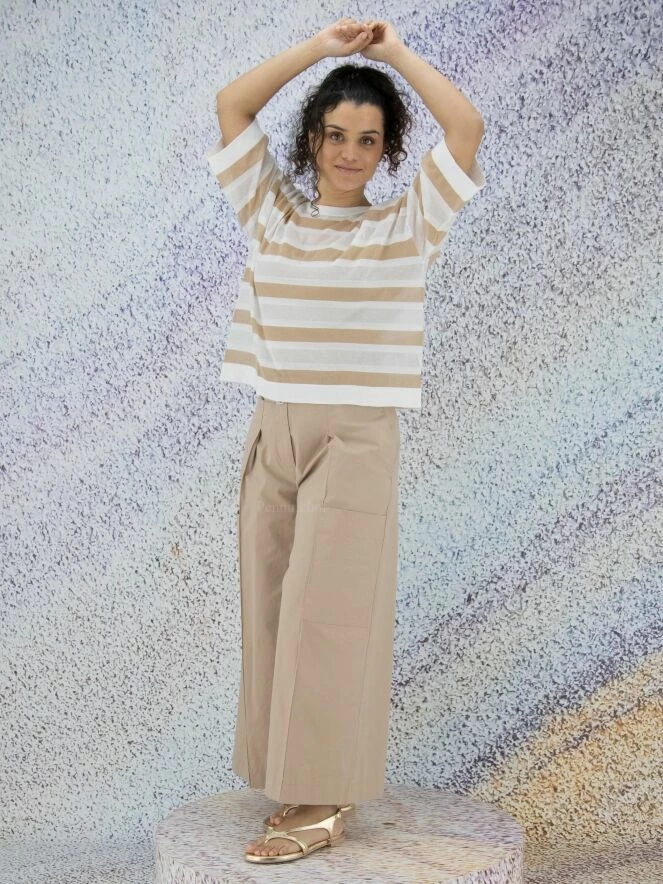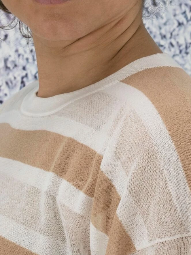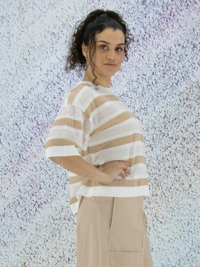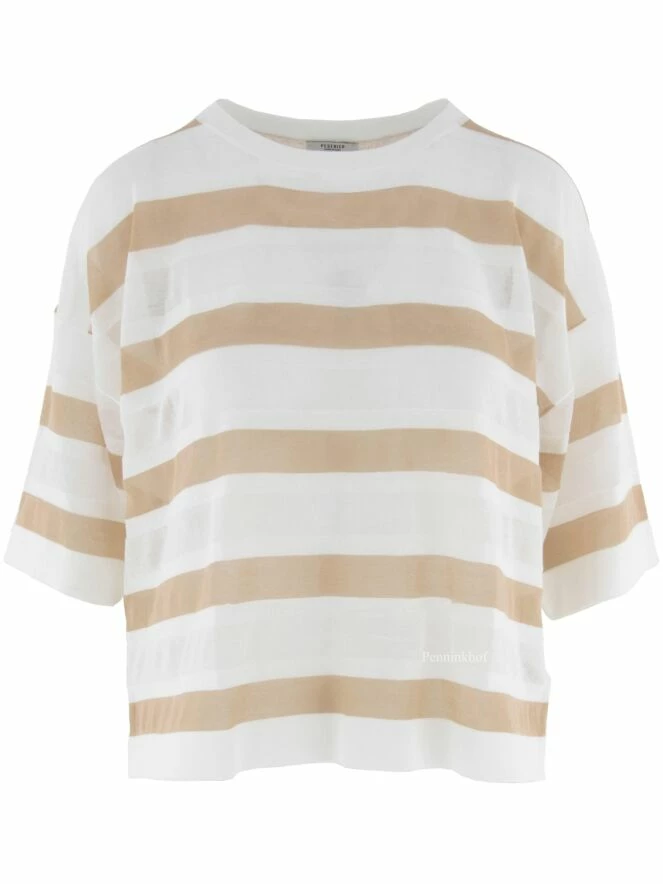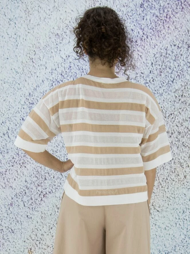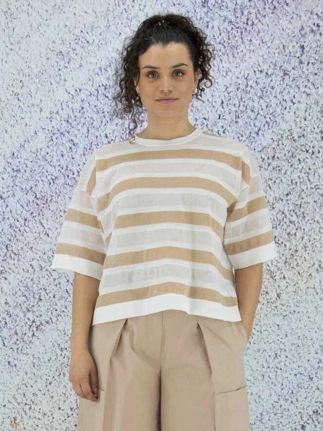 Tee-shirt ample de la marque Peserico, à larges rayures de couleur sable et blanc. Le tee-shirt présente un col rond et des manches courtes tombantes. Lavage à la main.