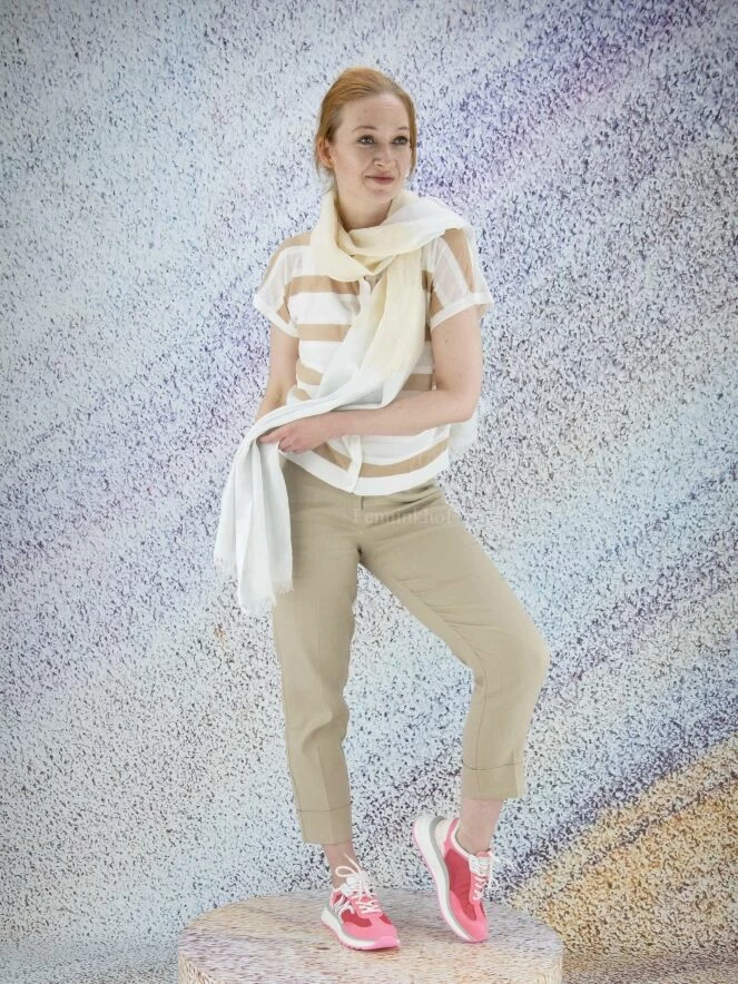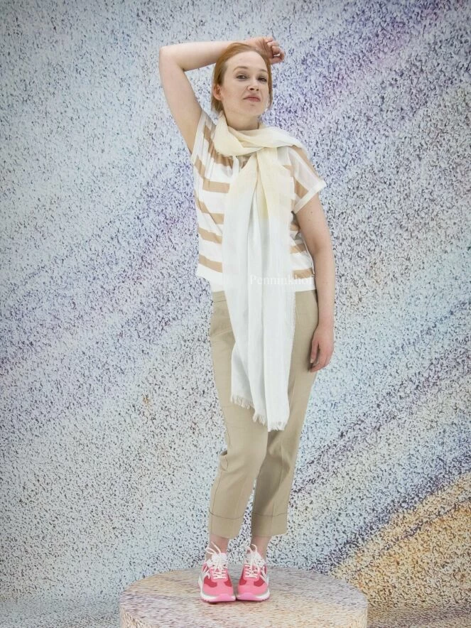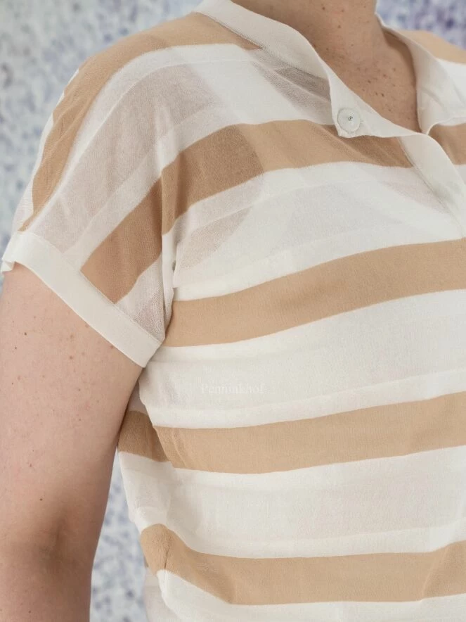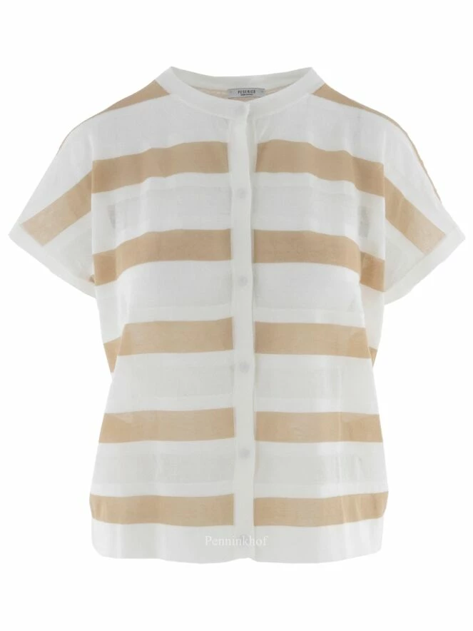 Cardigan légèrement transparent de la marque Peserico, à larges rayures beige beige sur fond blanc crème. Le cardigan présente des manches courtes. Il ferme avec une longue patte de boutonnage. Lavage à la main.