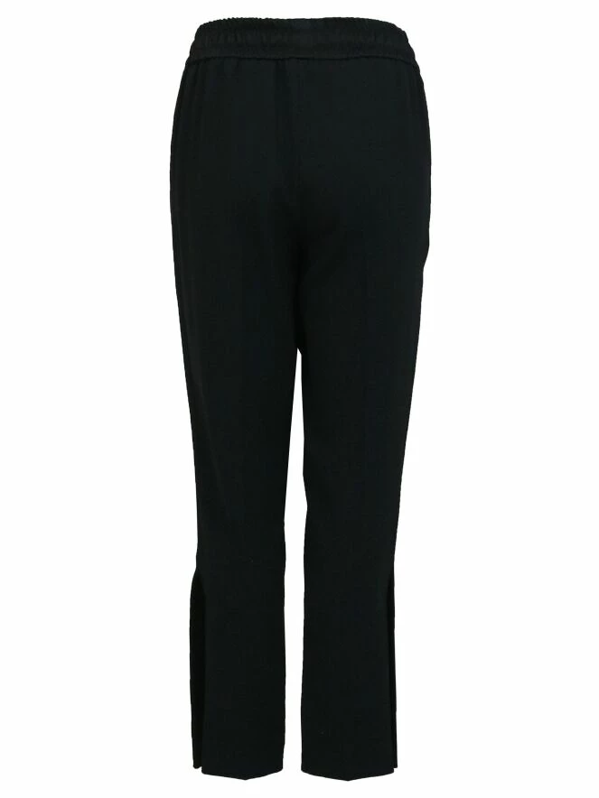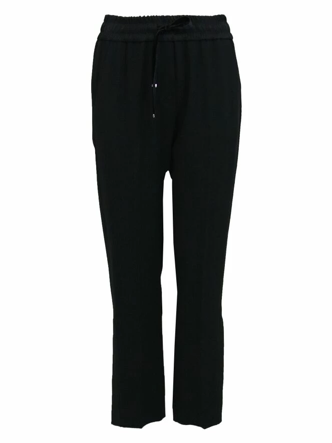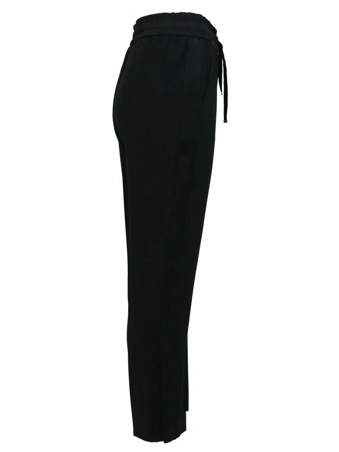 Pantalon de la marque Riani, de couleur noire. La taille est équipée d’une ceinture élastique à fronces, dans laquelle est inséré un cordon en satin mat se nouant sur le devant. Les côtés de la jambe présentent une bande noire satinnée se finnissant par une profonde fente. Le pantalon est muni de poches latérales. Lavage déconseillé.
