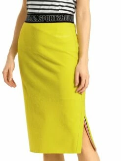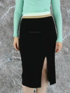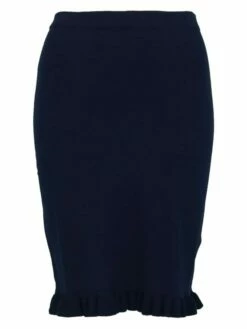 Jupe en tricot de forme légèrement cloche tombant juste au-dessus du genou, de la marque Riani. Une bande élastique est insérée à la taille. Le bas de la jupe présente un ourlet plissé. Modèle non doublé. Lavage à la main.