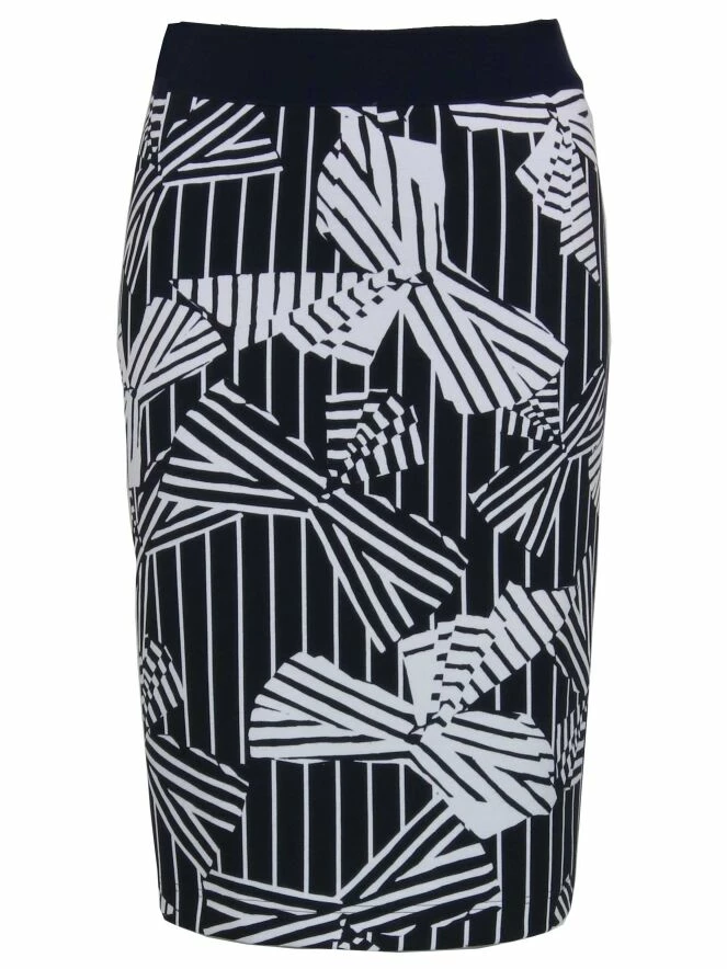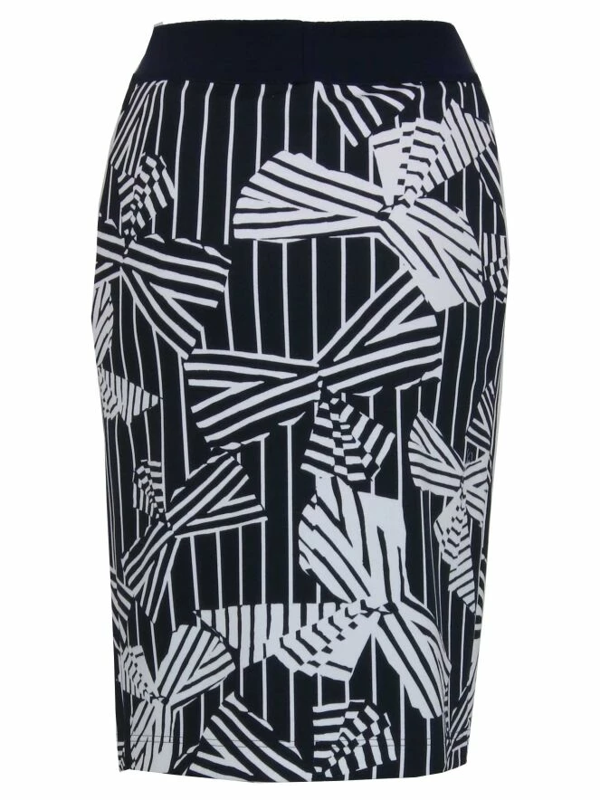 Jupe droite tombant sur le genou, de la marque Riani, imprimĂ©e d’un motif graphique de nĹ“uds blanc et bleu marine. Elle est Ă©quipĂ©e d’un large Ă©lastique noire Ă la taille. La jupe est doublĂ©e. Lavage dĂ©conseillĂ©.