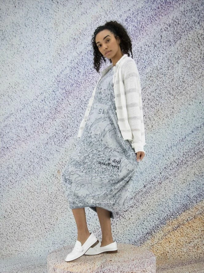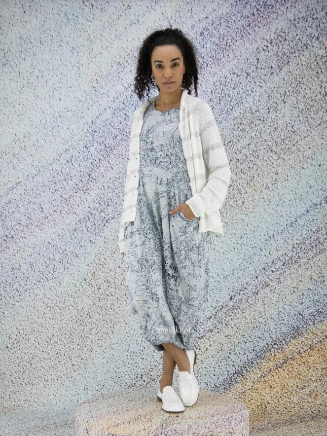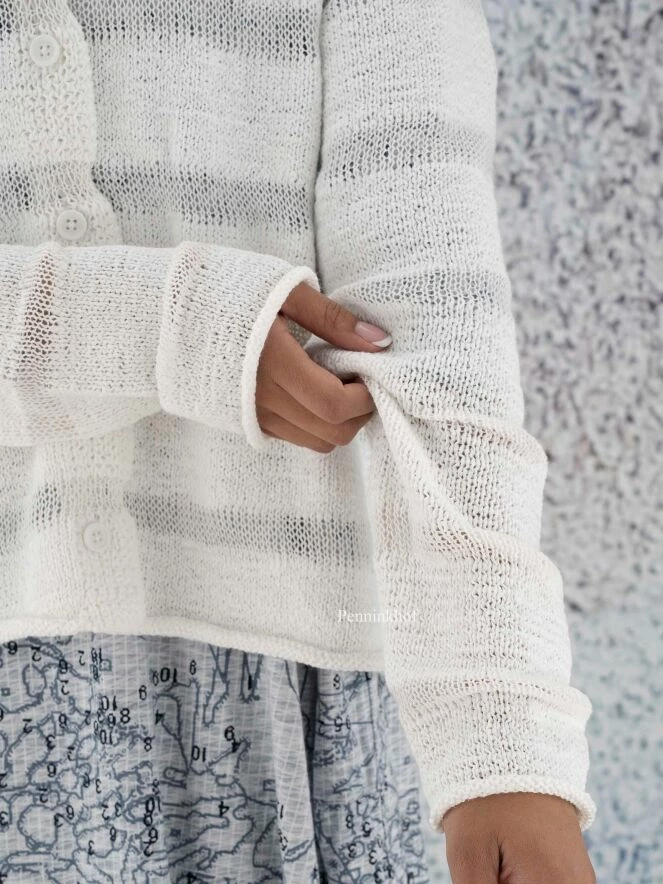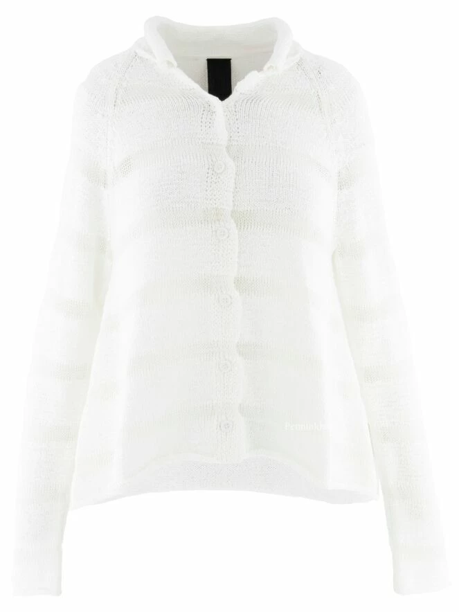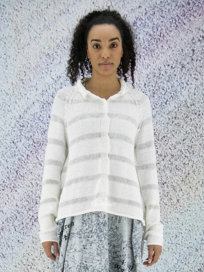 Gilet transparent à fermeture boutonnée de la marque Rundholz Black label, de couleur blanche. Un motif à rayures est tricoté dans le gilet, avec des zones moins transparentes. Les extrémités des manches et de l’ourlet du bas sont roulottés. Lavage à la main.