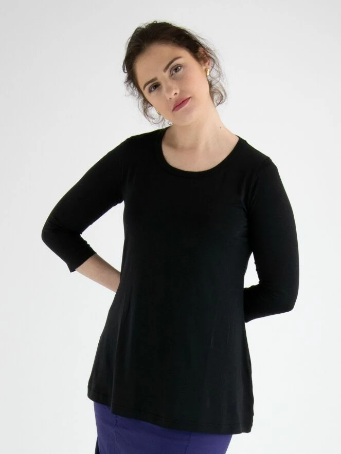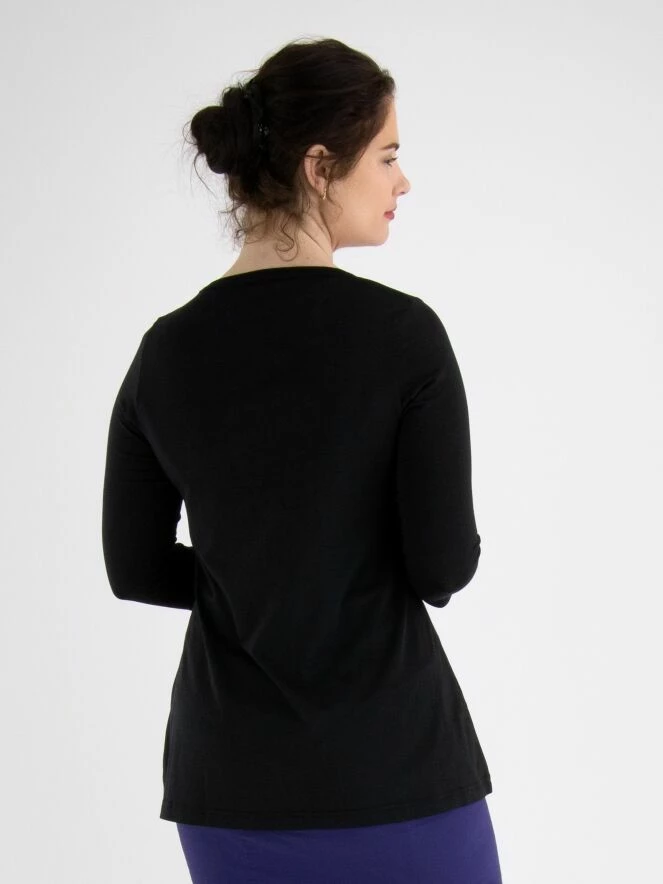 Un chemisier de Rundholz Black Label de couleur noire. Le chemisier présente un col rond et des manches mi-longues. Ce chemisier peut être lavé à 30 degrés.
