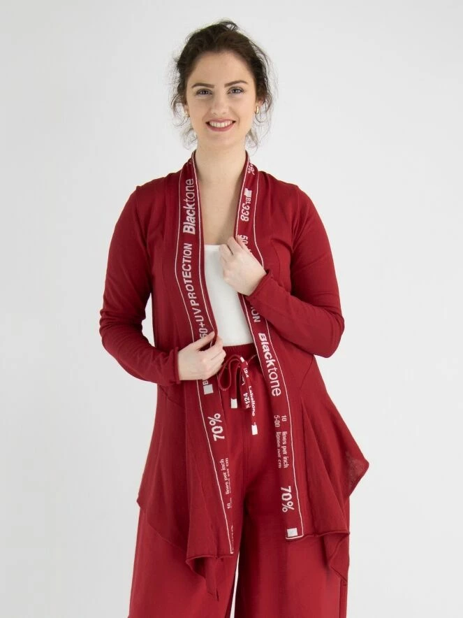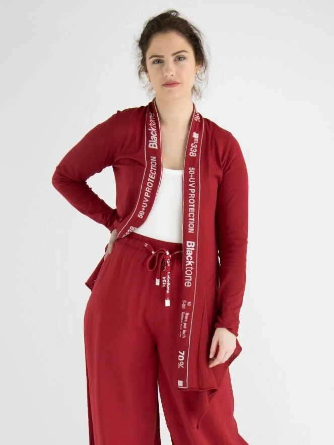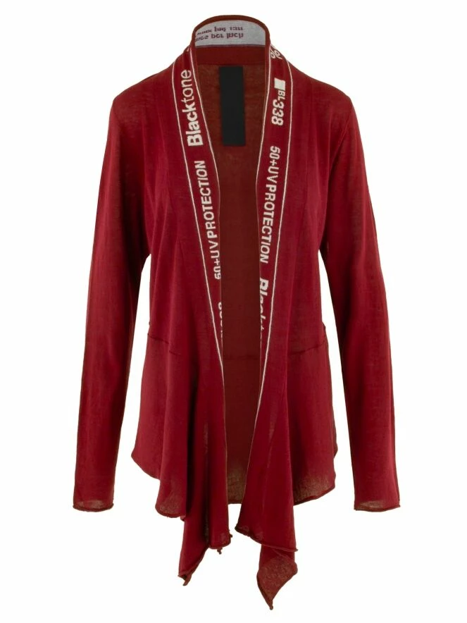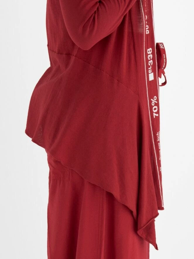 Un gilet léger et transparent de Rundholz Black Label en rouge. Le gilet n’a pas de fermeture, et le long du bord du col, il y a une large bande avec une impression de lettres rouge et blanche s’étendant jusqu’au bas du gilet. Le gilet a des manches longues et peut être lavé à la main.