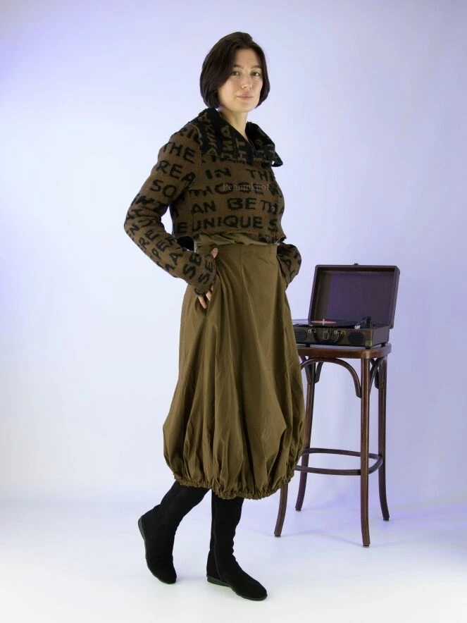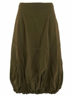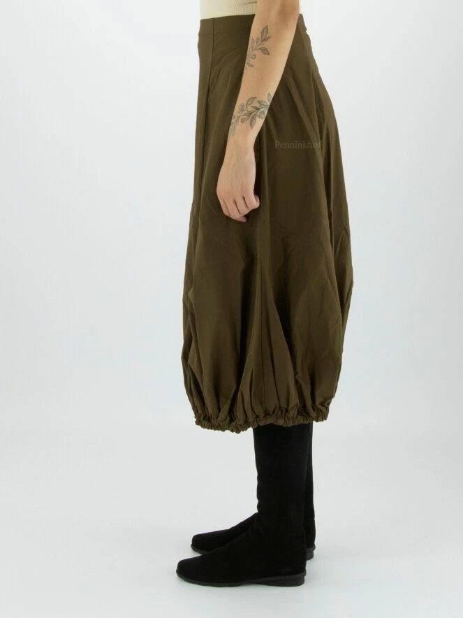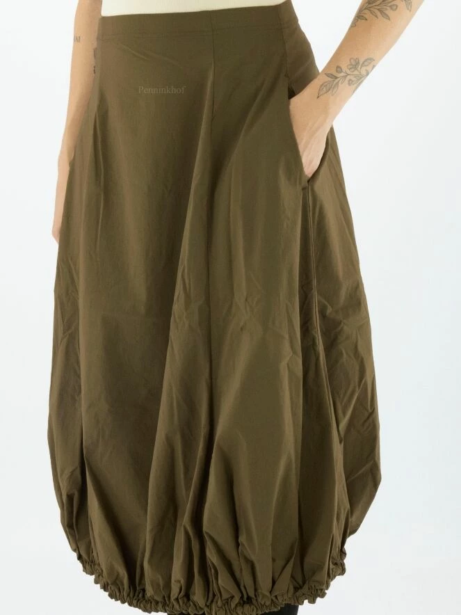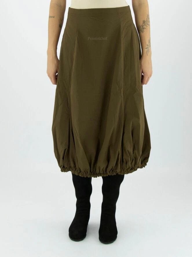 Jupe de Rundholz de couleur bronze. La taille est élastiquée. La jupe a des poches latérales et est doublée. Le bas de la jupe est bordé d’un élastique et le tissu est délicatement plissé. La jupe est en forme de ballon et peut être lavée à 30 degrés.