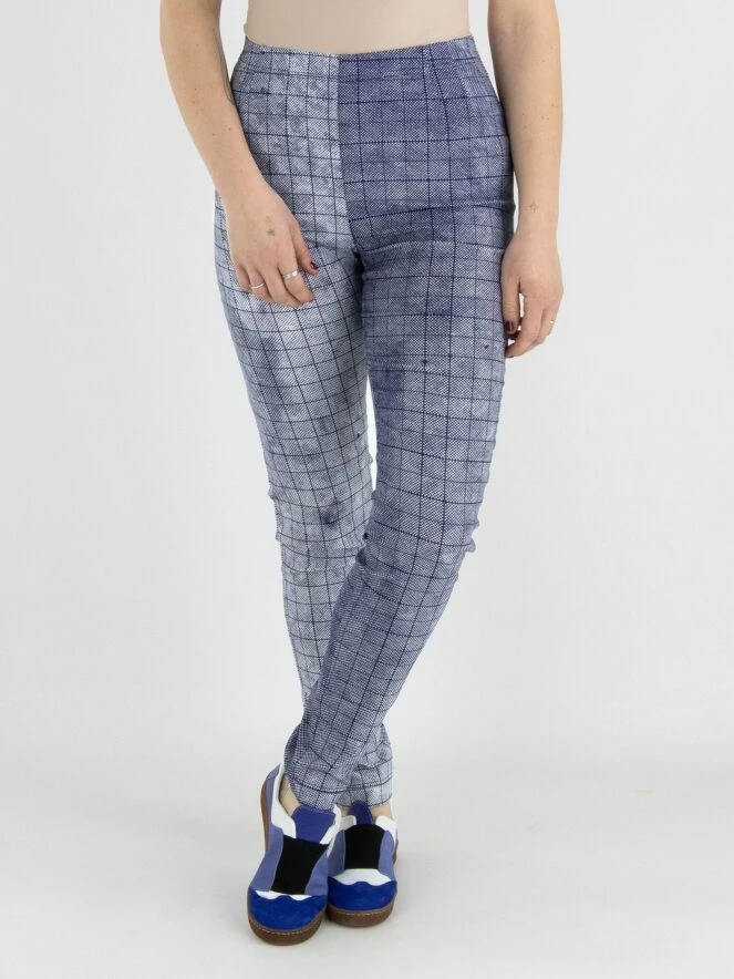 Un pantalon de Rundholz Black Label avec un motif à carreaux graphique varié en bleu indigo et blanc. Il y a une bande élastique étroite à la taille. Ce pantalon peut être lavé à 30 degrés.