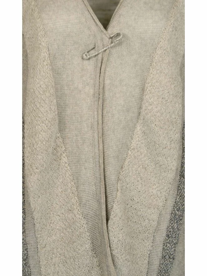 Gilet transparent de forme souple, de la marque Sarah Pacini, tricoté dans différentes mailles couleur sable. Sur les bandes latérales remontant sur les épaules, un fil argenté est ajouté, apportant une touche lumineuse. La fermeture se fait à l’aide d’une broche en forme d’épingle à nourrice recouverte du tissu. Modèle à col en V. Lavage à la main.