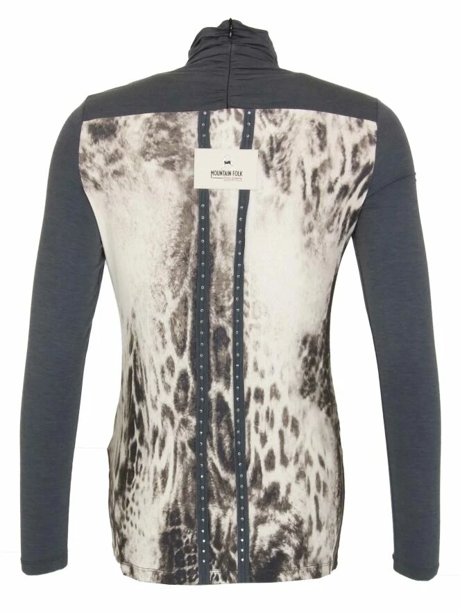 MODEL: KOVAK KLEUR: GRIJS MET PRINT MATERIAAL: 92% VISCOSE, 8% ELASTHAN LENGTE SHIRT: 70 CM