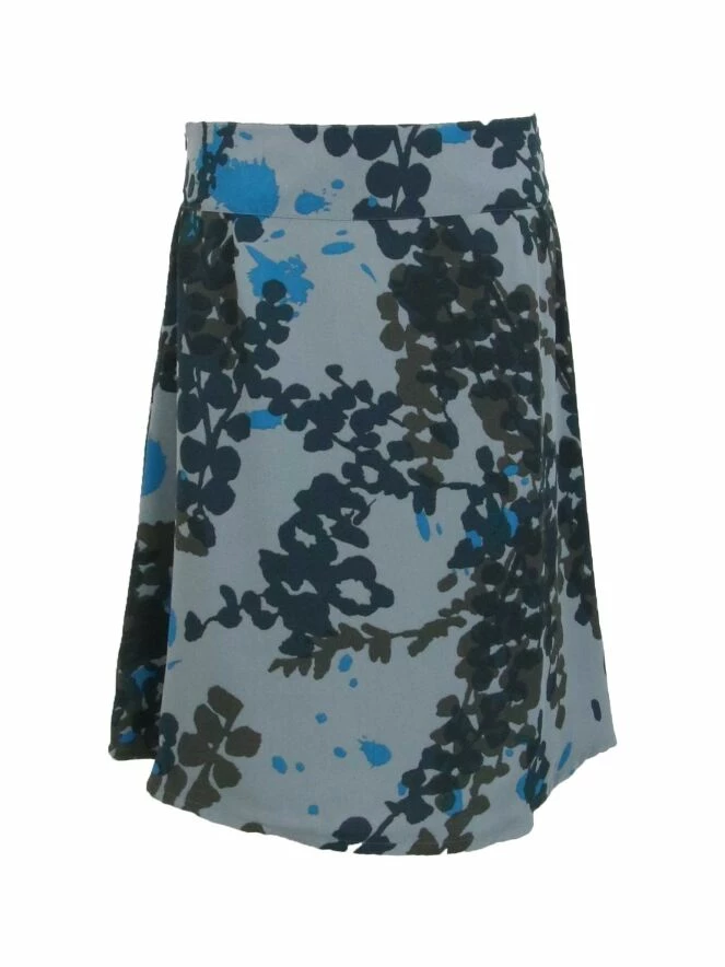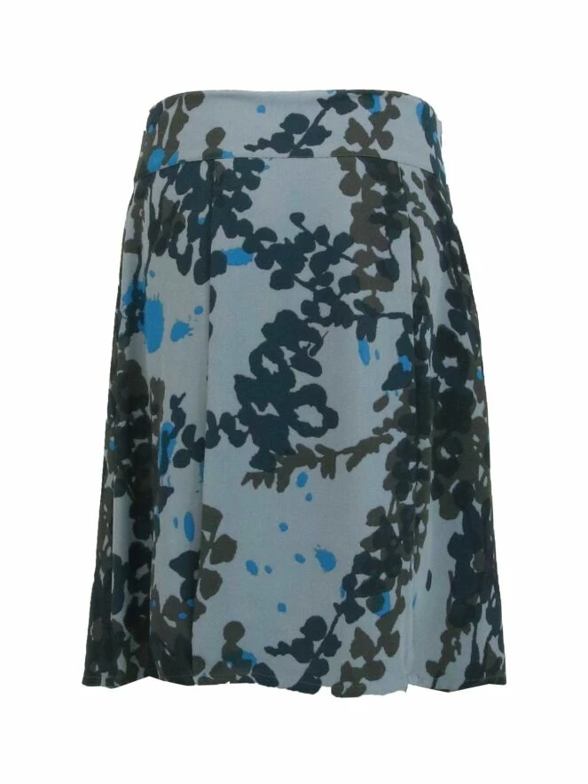 Un pantalon-jupe stylisé en jupe de Summum dans un imprimé feuille graphique avec des couleurs bleu aqua et plusieurs nuances de gris. Deux plis sont situés à côté du centre du devant, partant de la taille. La jupe est doublée et peut être lavée à 30 degrés.